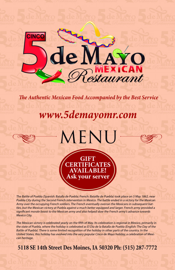 Family owned and operated, Cinco (5) de Mayo has been proudly serving the Des Moines area for years.